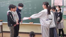 じゃんけん列車や椅子取りゲーム、ボッチャなどのゲームで楽しんだ後、みんなで作ったメッセージカードを6年生一人一人に贈りました。