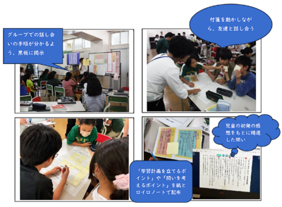 | 成果 | ・「自分たちが立てた問い」から授業を展開すること で、問いの必要感を感じ主体的に活動していた。 ・少人数で学びを進めていく中では、「個人で調査をし たい。」「グループで話し合いたい。」という児童の思 いを生かした。学び方を選択しながら進められるよう にすることで、学びの深まりが見られた。 ・自ら選択した言語活動では、「もっと」活動したいと 意欲的な姿が見られた。 |
